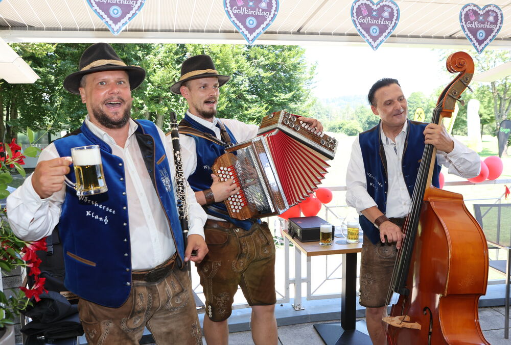 Moosburger Golf Kirchtag Der Präsident des Golfclubs Hannes Schwaiger lud zum 2. Moosburger Golfkirchtag. Dieses Charity Turnier wurde zugunsten der Golf – Jugend ausgetragen. Anschließend unterhielt die Trachtenkapelle „Wörthersee Klang“, die Golfer. Von der „Kredenzerei“ mit Melanie Wassermann und Igor Vasiljevic, wurde ein herrliches Spanferkel kredenzt. Mit dabei: Golfprofis Margit und Walter Mühlbacher, Ronald Mairitsch, Siegfried Ruppnig, Andreas Krassnitzer, Markus Galli, Jürgen Halwachs und Manfred Tengg: