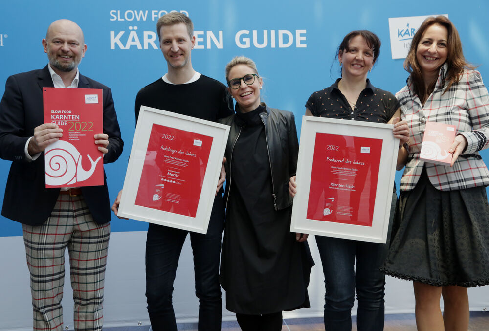 Bei der Vorstellung des neuen Guides in der Kärntner Tourismusschule in Villach wurden das Restaurant Moritz in Grafenstein von Anja Moritz und Roman Pichlerals „Aufsteiger des Jahres 2022", sowie die Fischzüchter von „Kärnten Fisch" (Andreas und Gabi Hofer aus Feld am See) als "Produzent des Jahres" ausgezeichnet.